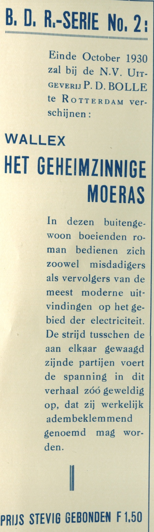 Op de flap van een ander boek van uitgeverij Bolle wordt "Het geheimzinnige moeras" aangekondigd met een verschijningsdatum: oktober 1930.