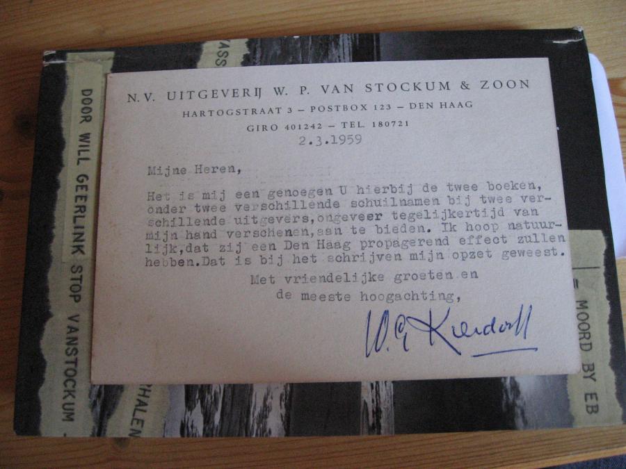 Uit de collectie van Frank Zwart komt deze foto van een briefje van W.G. Kierdorf (oprichter en voorzitter van de Geoffrey Gill-club) die onder de naam Pim Hofdorp een reeks detectiveverhalen heeft gepubliceerd. In het briefje wordt vermeld dat er in 1959 twee boeken onder pseudoniem zijn verschenen. Het eerste is "Moord by eb" onder pseudoniem Wil Geerlink. Het 2e boek moet zijn "Moord met staatsie" onder pseudoniem Wil Wanting.