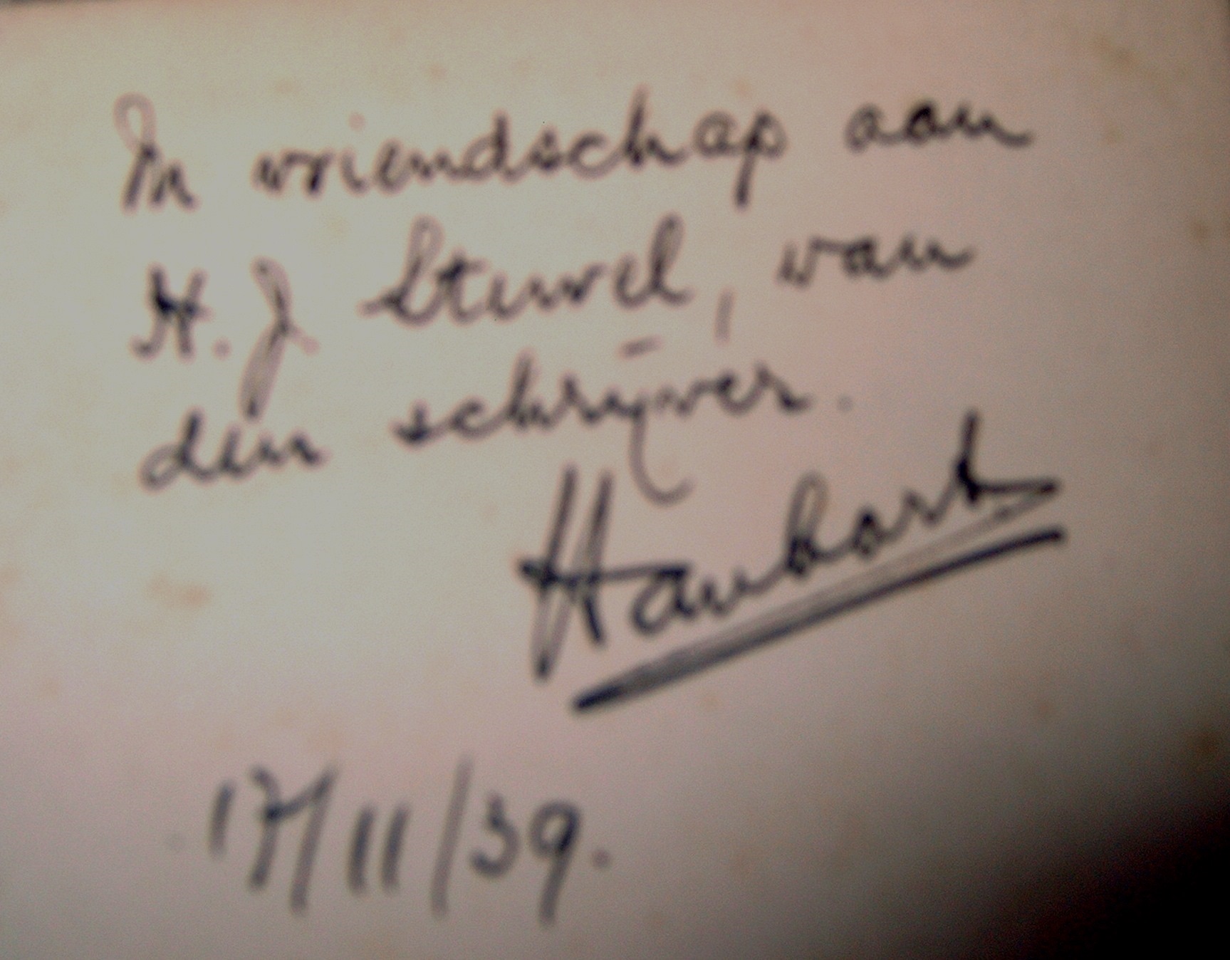In het boek zit een opdracht gesigneerd door de schrijver, ondertekend door Hanhart.
